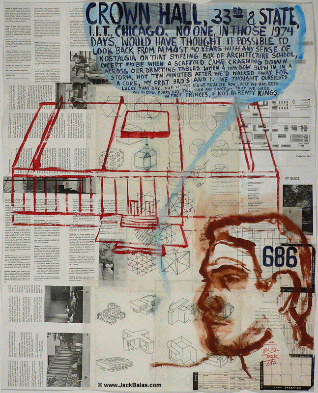 Jack Balas, 2011; CROWN HALL (#686); acrylic and ink on collaged papers; approx. 39" x 31"