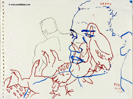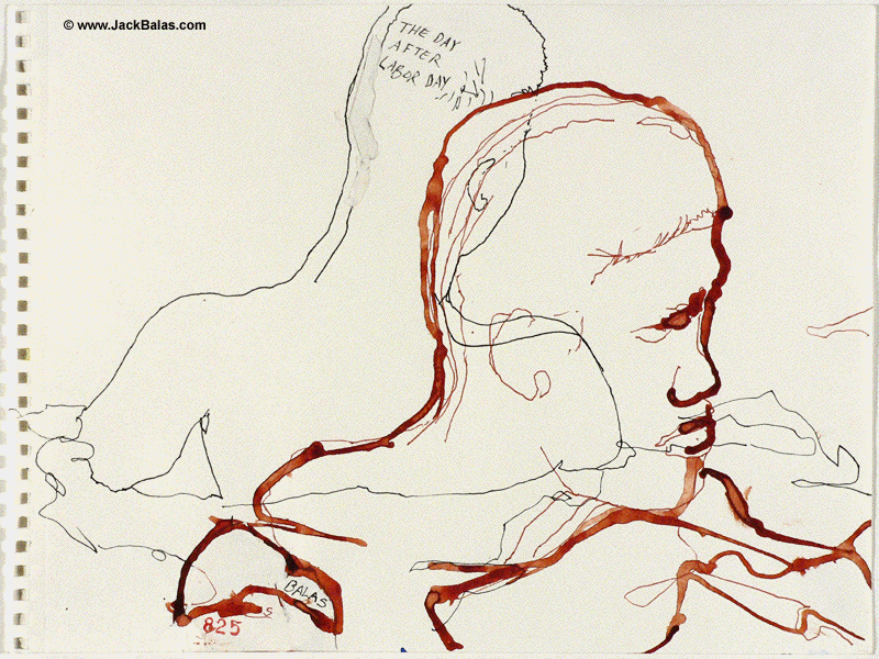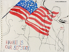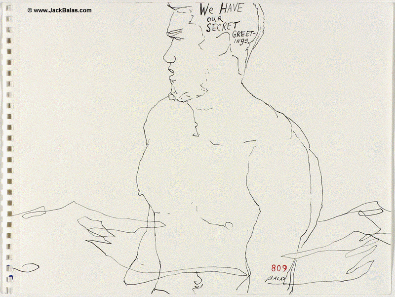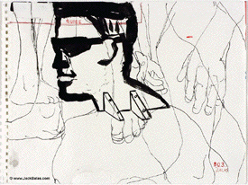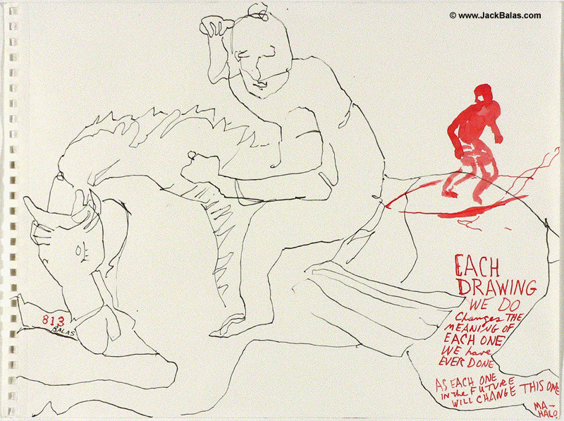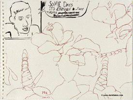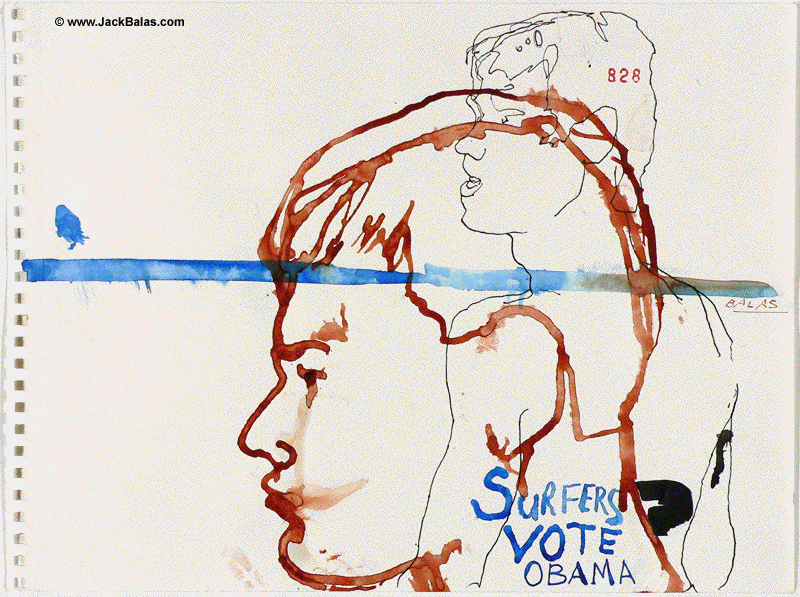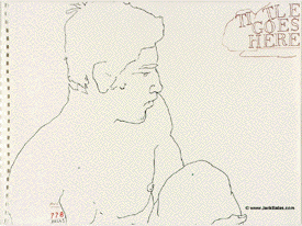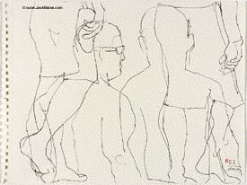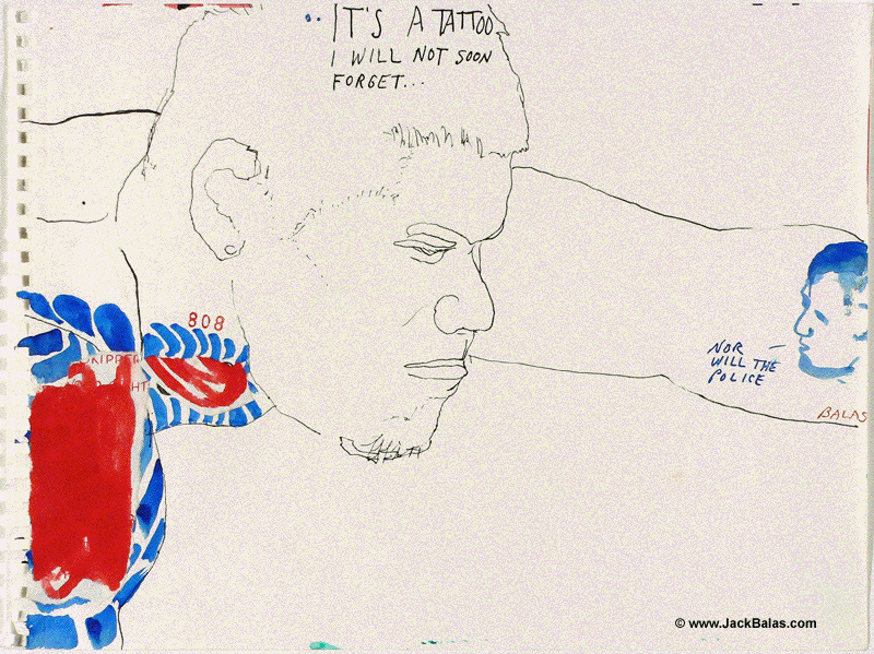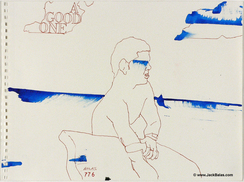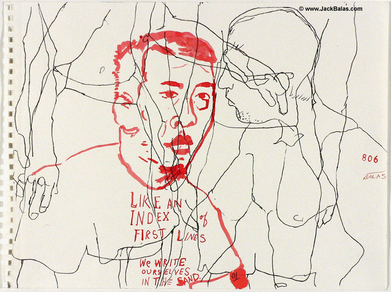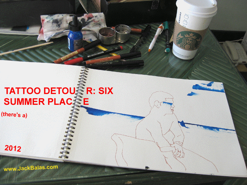 The sixth year in the TATTOO DETOUR series, the drawings this year all measure 9" x 12" and are ink on paper. ------------------ Normally when traveling I've been content to walk around, explore and take photos while visiting art museums and galleries -- a method that works fine in New York or Paris when you're there for a week or so. But finding myself in Honolulu for an extended stay the last four summers, I realized that Waikiki is a different animal altogether, relentless as it is with the shirtless men who are my muse, not only on the beach but in the restaurants, grocery stores, hotel lobbies, even on the bus. So I was tempted to go further than my normal mode and try to have a studio at the same time, namely a sketchpad and a handful of pens I was carrying around, creating a body of work out of a suitcase while living in a hotel room. Drawing on the aforementioned beaches, and in the same restaurants and hotel lobbies, I was able to enjoy a completely different rythmn of work than I've ever known at home, at the same time surrounded by people who occasionally wandered over to look at what I was up to so long at my favorite Starbuck's table or on some bench in Kapiolani Park, or under a palm tree. And the setting of an extreme tourist spot such as Waikiki posed the enjoyable task of trying to reach beyond the predictable cliches of surfers, babes and palms. The resulting drawings are conflations of those very surfers, palms, tattoos, military guys, pigeons, lobby furniture, waves and restaurant tables, offering intersections between the surf of Hockney, Picabia, Pettibon, Guston and Westermann, fact and fiction.