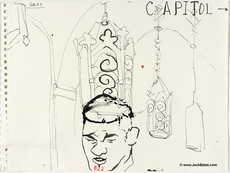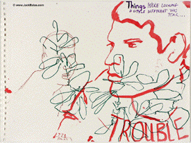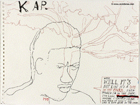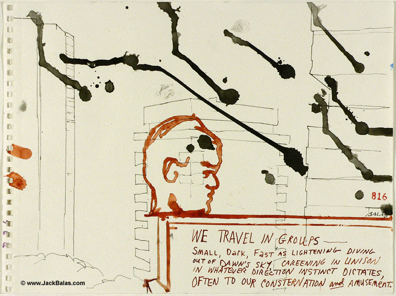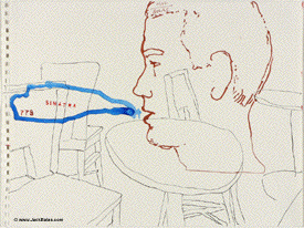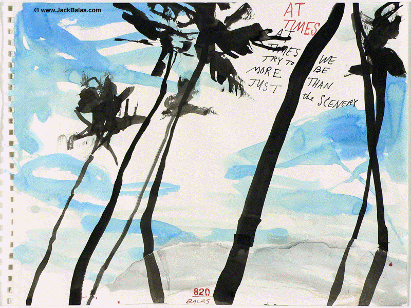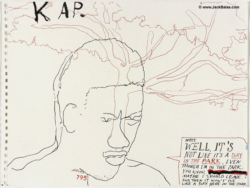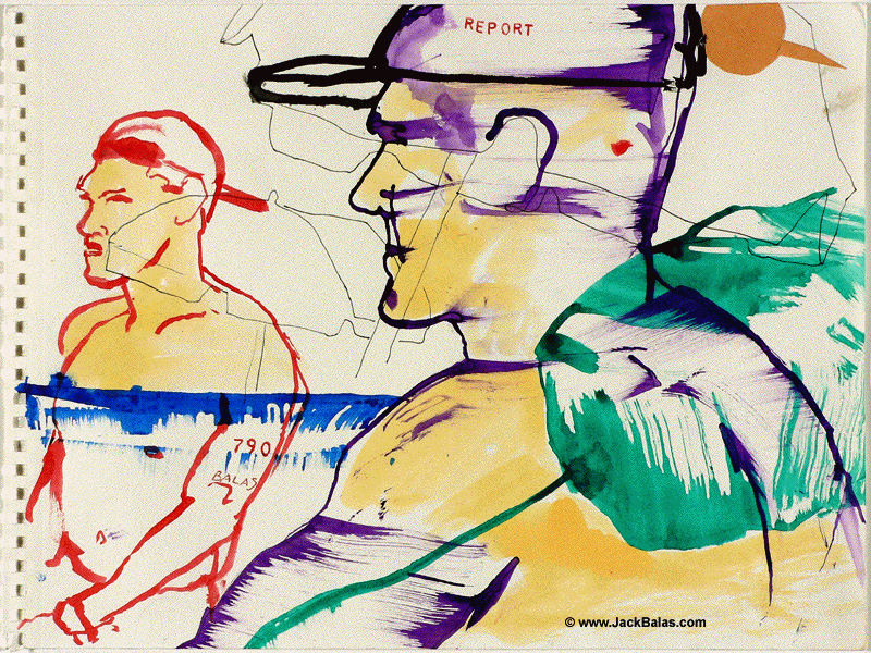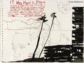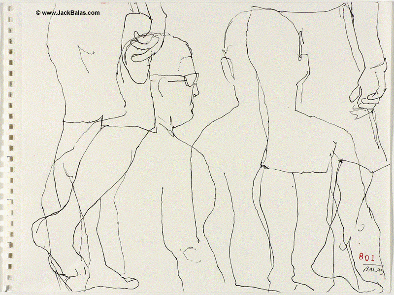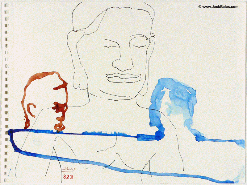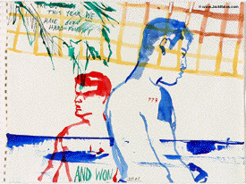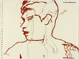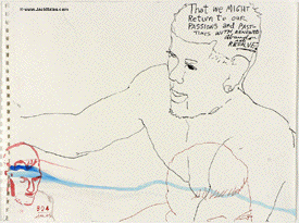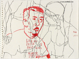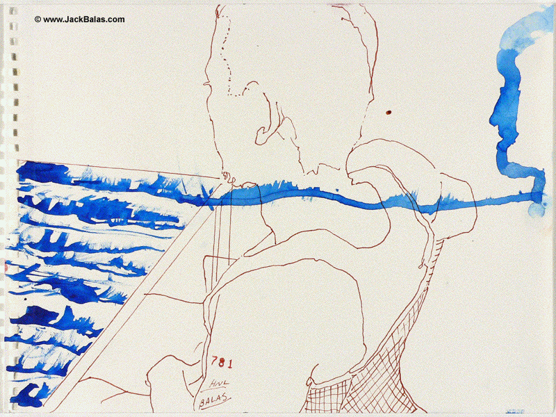 The sixth year in the TATTOO DETOUR series, the drawings this year all measure 9" x 12" and are ink on paper. ------------------ Normally when traveling I've been content to walk around, explore and take photos while visiting art museums and galleries -- a method that works fine in New York or Paris when you're there for a week or so. But finding myself in Honolulu for an extended stay the last four summers, I realized that Waikiki is a different animal altogether, relentless as it is with the shirtless men who are my muse, not only on the beach but in the restaurants, grocery stores, hotel lobbies, even on the bus. So I was tempted to go further than my normal mode and try to have a studio at the same time, namely a sketchpad and a handful of pens I was carrying around, creating a body of work out of a suitcase while living in a hotel room. Drawing on the aforementioned beaches, and in the same restaurants and hotel lobbies, I was able to enjoy a completely different rythmn of work than I've ever known at home, at the same time surrounded by people who occasionally wandered over to look at what I was up to so long at my favorite Starbuck's table or on some bench in Kapiolani Park, or under a palm tree. And the setting of an extreme tourist spot such as Waikiki posed the enjoyable task of trying to reach beyond the predictable cliches of surfers, babes and palms. The resulting drawings are conflations of those very surfers, palms, tattoos, military guys, pigeons, lobby furniture, waves and restaurant tables, offering intersections between the surf of Hockney, Picabia, Pettibon, Guston and Westermann, fact and fiction.