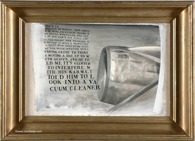 Jack Balas, 1991; THE MOTH INVASION; oil on canvas, 13" x 19"; in antique gold frame, 17" x 23"