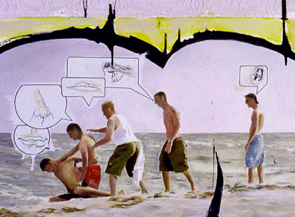 Jack Balas, Depth Charge (#6) 2002; oil, ink & enamel on canvas with bath towel; 48" x 40"