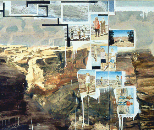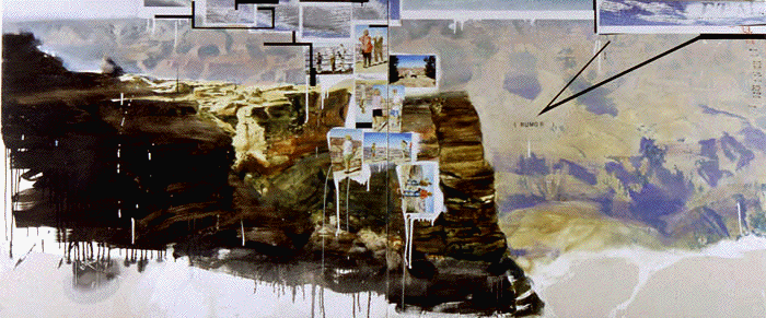 Note: RUMOR was the result of a stop at the Grand Canyon this spring where, on a somewhat hazy day, I became more interested in my fellow tourists than the landscape we were all looking at. As everyone walked past, oblivious to the guy with the camera sitting 15 feet back from the rim, I was mesmerized by this passing parade of humanity who were, perhaps for the first time, considering the grand evidence of our mortality, our ephemerality so graphically suggested by layer upon rock layer of the eons of time. While the central vignettes are close-up paintings of tourists, the upper images are clouds over which have been inked random names from the phone book. Click on image for detail