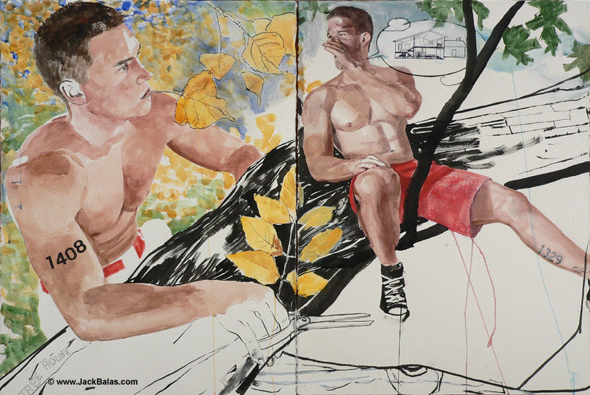 Jack Balas, 2016; TREEHOUSE (#1408- 1329); watercolor, ink and acrylic on 2 paper panels, 30" x 45" overall.
