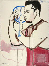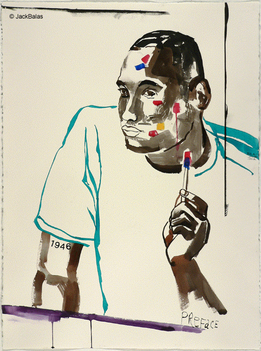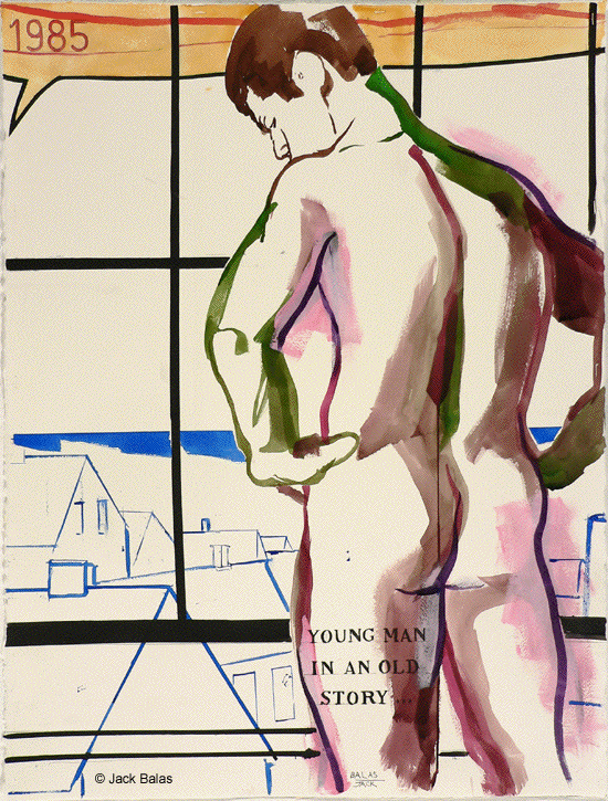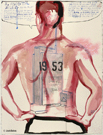 Jack Balas, 2020; THE PRUDENTIAL BUILDING (#1953); India ink and acrylic on paper, 30x22 inches. The Prudential Building was the tallest building in Chicago the year my 4th grade class took a field trip to downtown. I'd never been in a plane before, and it would be years until, but there from the 42nd floor I could see all over the city and even all the way across Lake Michigan, the shoreline, everything. I was smitten. These days when I visit there are buildings way taller, but the Prudential Building, with the Rock of Gibralter on its face- I go in and try to see across to 1964 and me.