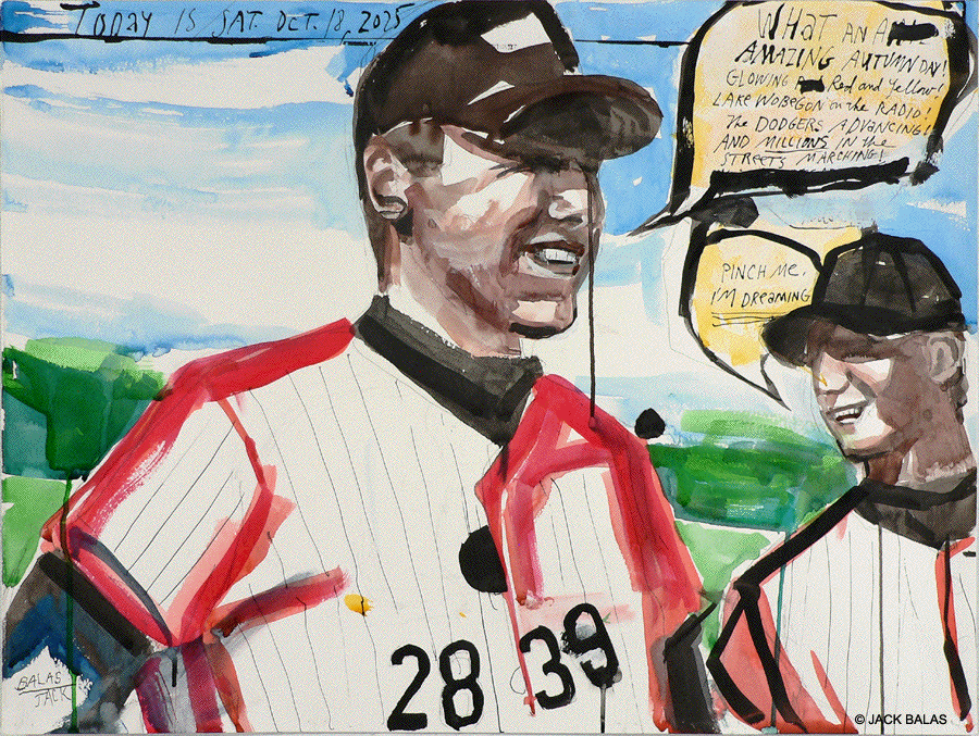 ![]() PINCH ME, I'M DREAMING! (#25-2839) India ink & acrylic on paper panels, 18 x 24 inches What an amazing autumn day! Glowing red and yellow! Lake Wobegon on the radio! The Dodgers advancing! And millions in the streets marching! Pinch me, I'm dreaming. (Today is Saturday Oct. 18, 2025) |