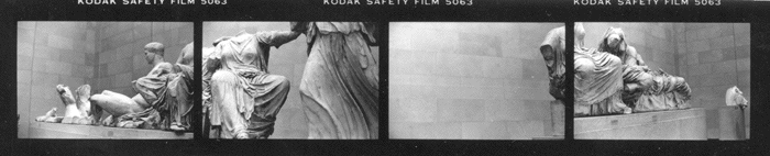 | These panorama photos are comprised of continuous frames of 35mm film and printed as a single image, black spacer-bars included. I began such multi-frame images in 1979 making vertical portraits of friends with a 120 camera. Then in the 1980's, with a coast-to-coast truck-driving job as an art-shipper for five years, I started to concentrate on the broad horizons that filled my days. But the more I worked, the less concerned I became in keeping the image lined up exactly from frame to frame; rather, I started to bend the space in various ways and to repeat it in places, hoping to heighten the sense of fragmentation already provided by the black spacer bars. When I look at the sprocket holes in places, the emulsion notes and frame numbers printed to document the continuous nature of each piece, I realize not only that they were documenting the passage of time (between exposing the frame on the left and the one farthest to the right), but that they also were looking forward to my 2002 paintings that are similarly numbered in sequence and stamped with the dates of time's passing. |